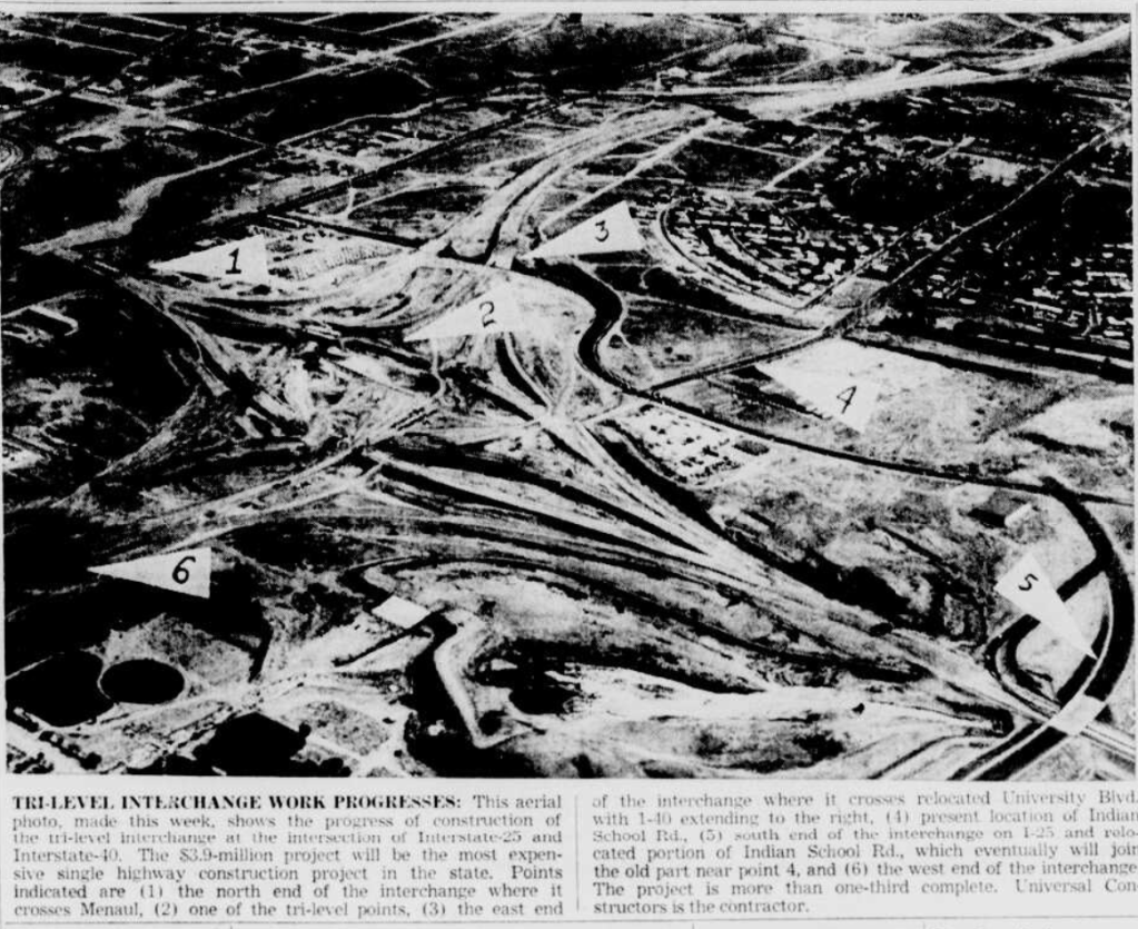 The interchange would become known, in time, as the Big I. It was to be the most expensive public works project in the city’s history up to that time, linking highspeed superhighways that would replace the old Routes 66 and 85.