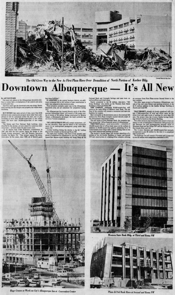 After years of delay, civic leaders chose to anchor Albuquerque’s future in its core. The Convention Center was ultimately sited west of the railroad tracks, just north of the old City Hall and east of the Courthouse. The First Plaza Galleria and the Plaza del Sol rose in its wake. New banks went up on Roma and Third. In newspaper clippings from 1972, bulldozers flatten blocks of the Korber Building, promising that “Downtown Albuquerque—It’s All New.” Cranes towered over the construction of the Convention Center, casting long shadows on cleared lots and demolition dust.
