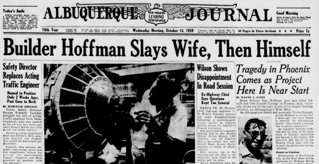 The news sent shockwaves through Phoenix and Albuquerque alike. Hoffman had not only been a builder of homes but a builder of cities—his name etched into streets, subdivisions, and shopping centers. He had arrived in Albuquerque nearly a decade earlier and helped reshape the East Mesa with developments like Hoffmantown and Inez. He was, in 1954, the second largest homebuilder in the nation.