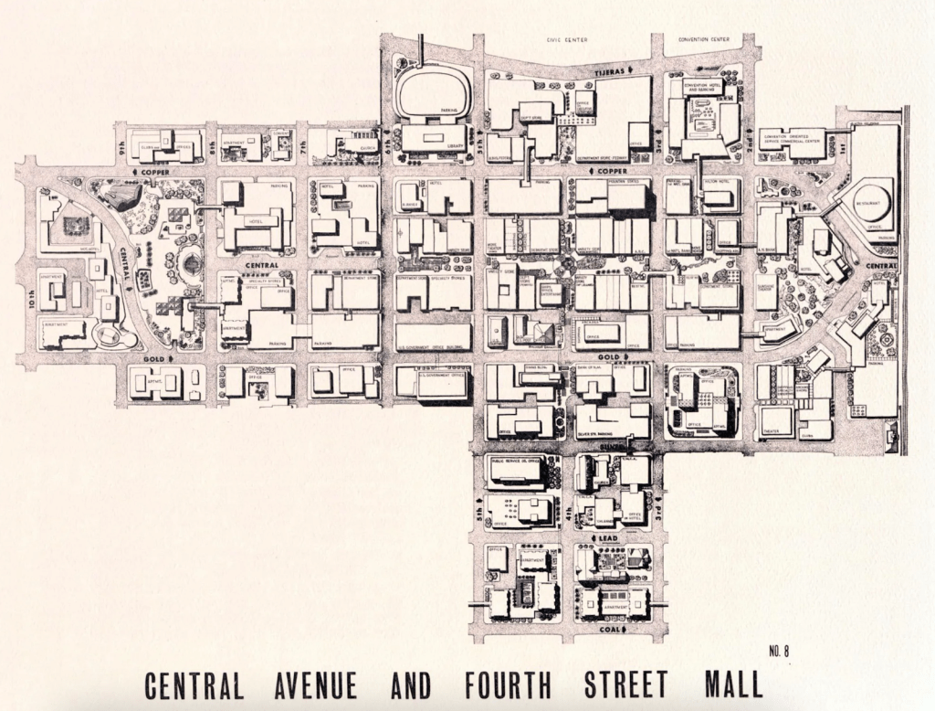 In these photos, we see the physical traces of erasure: block after block flattened, cleared for structured parking or left fallow. The “core area”, as one caption put it, was now defined by overpasses and underground garages. Where homes, hotels, and neighborhood shops once stood, the city created plazas and arterials. Gold Avenue and Copper Avenue were widened into one-way, multi-lane stretches; Fourth Street was turned into a pedestrian mall and blocked off at Central—ironically eliminating the spine that once animated the city.