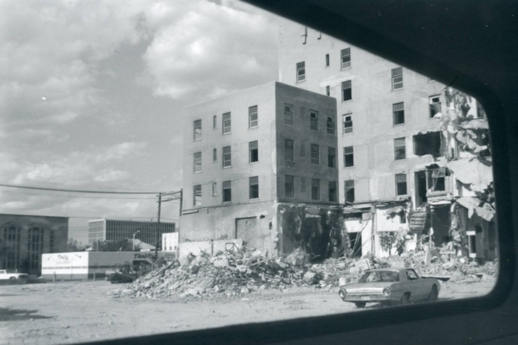 But what was being removed weren’t just buildings. They were homes, stores, corner lots, churches. Lives arranged around alleys and porches and small shared yards.