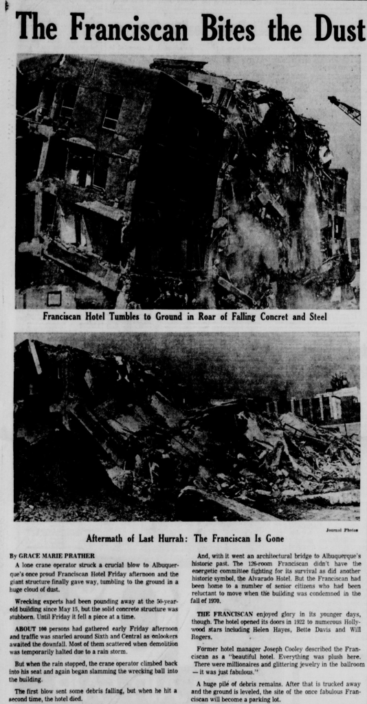 On the same weekend that bank tellers shook hands and served coffee under imported marble on San Mateo Boulevard, a lone crane operator downtown struck a final blow. Concrete groaned, the roof gave way, and the Franciscan Hotel, once among the city’s proudest addresses, tumbled to the ground in a roar of dust and rebar. Fifty years of memory collapsed into a pile of debris. By dusk, the site was leveled. The hotel that once hosted Helen Hayes and Will Rogers would become, in time, a parking lot.