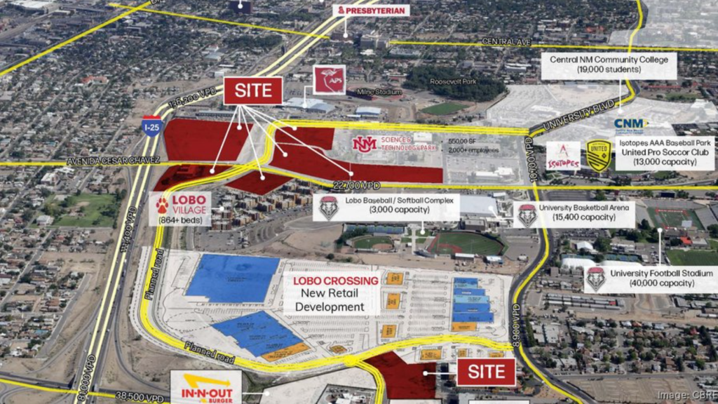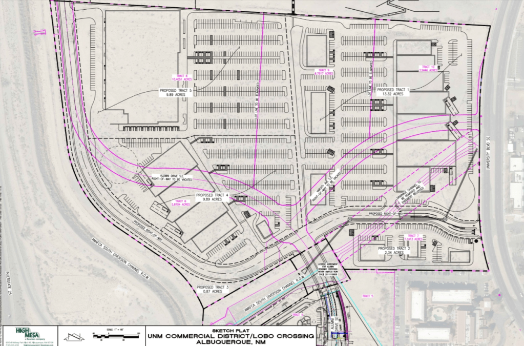 At first glance, it’s unremarkable: some rectangles labeled “proposed tracts,” a few looping roads, and rows upon rows of parking stalls. But look closer, and it tells a story. One of the most valuable, visible pieces of land in Albuquerque, a site between the university, the Rail Runner, the South Diversion Channel, and Downtown, is being handed over to a development pattern that could exist anywhere in the United States. It’s called Lobo Crossing, and if built as drawn, it will be a suburban shopping center surrounded by asphalt.