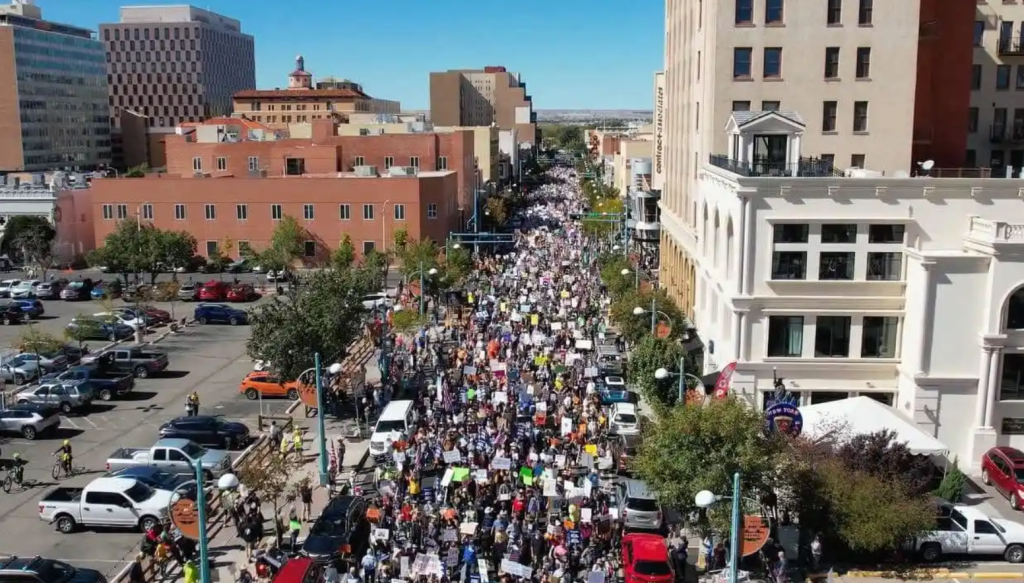 On Saturday, October 18th, up to 45,000 people gathered in Downtown Albuquerque under the banner of the No Kings protest. “Thousands of New Mexicans gathered in downtown Albuquerque … expressing concerns over democracy and human rights,” reported KOAT. “As thousands walked, streets became closed off, and drivers stepped out of their vehicles to witness what they called a piece of history.” (KOAT)